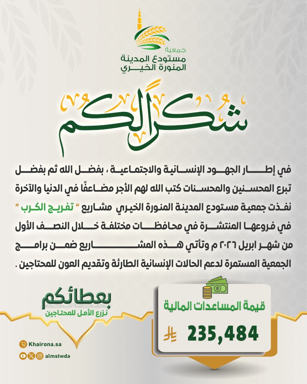 بسم الله الرحمن الرحيم الحمد لله الذي تتم الصالحات والصلاة والسلام على أشرف الأنبياء والمرسلين وخاتم النبيين صلى الله عليه وسلم وبعد فقد سرني ما اطلعت عليه مساء الثلاثاء 7/ 7 / 1427 هـ أثناء جولتنا على المستودع الخيري بالمدينة المنورة بمناسبة انعقاد مجلس الاشراف على المستودع وما شاهدناه من اهتمام بالغ من القائمين عليه وما وفقوا إليه من حسن التنظيم والترتيب لمدخرات وامكانيات المستودع وطريقة إيصال المساعدات الى مستحقيها دون عناء او مشقة وحرصهم على الوصول الى المستفيد في موقعه .وبهذا المناسبة نحمد الله عز وجل اولاً على ما من به على هذه البلاد من نعم كثيرة ثم الشكر لكل من أسهم في تأسيس وبناء ودعم هذا المشروع الخيري سائلين المولى القدير أن يوفق الجميع لما يحبه ويرضاه من القول والعمل .والسلام عليكم ورحمة الله وبركاته