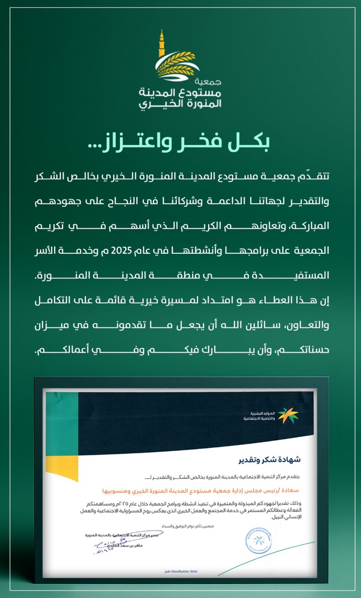 لقد سرني ما شاهدته اليوم أثناء زيارتي للمستودع الخيري بالمدينة المنورة مما يبذل من جهود مميزة للقيام بمهام هذا المستودع من ناحية الأنظمة المتبعة والسرية في اعانة المحتاجين وكذلك استلام المعونات من المساهمين في هذا العمل الخيري مما يدل على وعي المسؤولين العاملين بهذا الصرح الخيري وبهذا المناسبة الطيبة أتقدم بالشكر و التقدير للأخ الدكتور / يحيى اليحيى والعاملين معهم لما يبذلونه من مجهودات جليلة في هذا المجال داعياً الله سبحانه وتعالى ان يوفقهم ويعينهم على تقديم هذه الخدمات وان يجزيهم خير الجزاء .