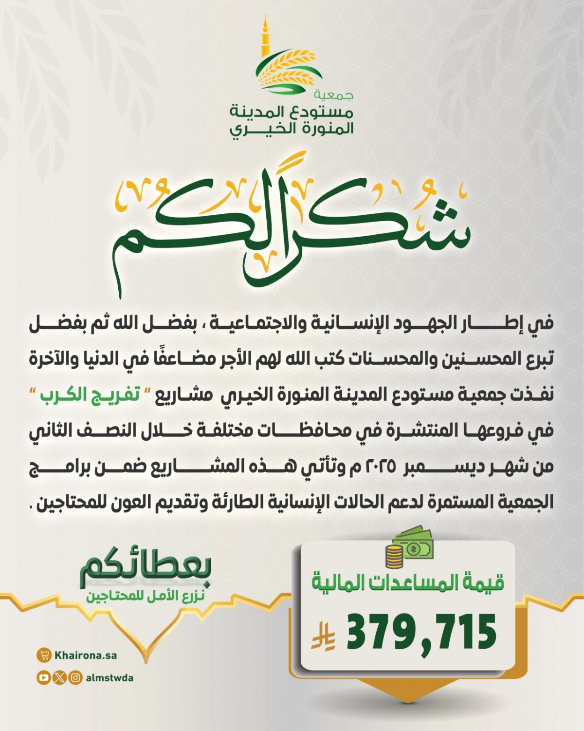 بسم الله الرحمن الرحيم الحمد لله الذي تتم الصالحات والصلاة والسلام على أشرف الأنبياء والمرسلين وخاتم النبيين صلى الله عليه وسلم وبعد فقد سرني ما اطلعت عليه مساء الثلاثاء 7/ 7 / 1427 هـ أثناء جولتنا على المستودع الخيري بالمدينة المنورة بمناسبة انعقاد مجلس الاشراف على المستودع وما شاهدناه من اهتمام بالغ من القائمين عليه وما وفقوا إليه من حسن التنظيم والترتيب لمدخرات وامكانيات المستودع وطريقة إيصال المساعدات الى مستحقيها دون عناء او مشقة وحرصهم على الوصول الى المستفيد في موقعه .وبهذا المناسبة نحمد الله عز وجل اولاً على ما من به على هذه البلاد من نعم كثيرة ثم الشكر لكل من أسهم في تأسيس وبناء ودعم هذا المشروع الخيري سائلين المولى القدير أن يوفق الجميع لما يحبه ويرضاه من القول والعمل .والسلام عليكم ورحمة الله وبركاته
