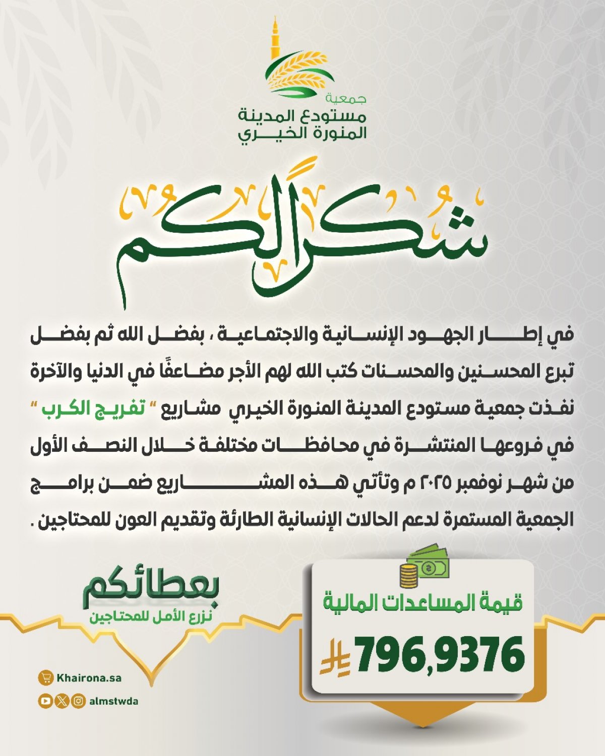 بسم الله الرحمن الرحيم الحمد لله الذي تتم الصالحات والصلاة والسلام على أشرف الأنبياء والمرسلين وخاتم النبيين صلى الله عليه وسلم وبعد فقد سرني ما اطلعت عليه مساء الثلاثاء 7/ 7 / 1427 هـ أثناء جولتنا على المستودع الخيري بالمدينة المنورة بمناسبة انعقاد مجلس الاشراف على المستودع وما شاهدناه من اهتمام بالغ من القائمين عليه وما وفقوا إليه من حسن التنظيم والترتيب لمدخرات وامكانيات المستودع وطريقة إيصال المساعدات الى مستحقيها دون عناء او مشقة وحرصهم على الوصول الى المستفيد في موقعه .وبهذا المناسبة نحمد الله عز وجل اولاً على ما من به على هذه البلاد من نعم كثيرة ثم الشكر لكل من أسهم في تأسيس وبناء ودعم هذا المشروع الخيري سائلين المولى القدير أن يوفق الجميع لما يحبه ويرضاه من القول والعمل .والسلام عليكم ورحمة الله وبركاته