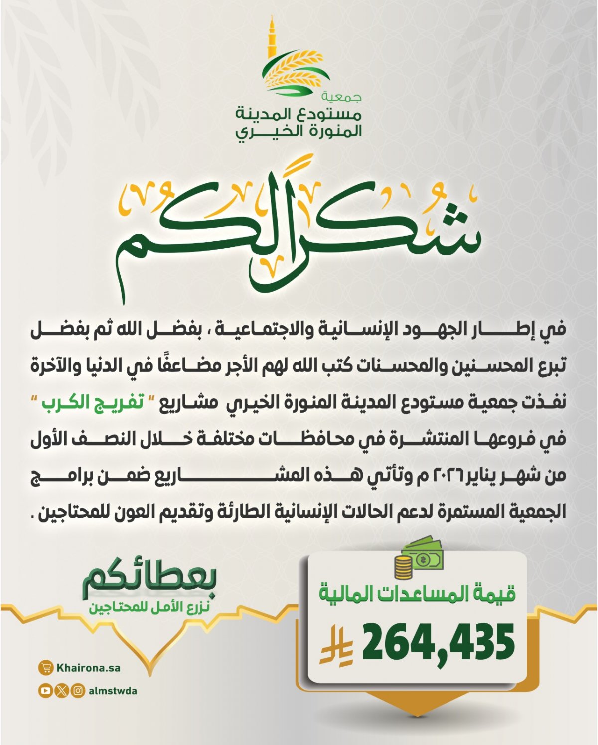 بسم الله الرحمن الرحيم الحمد لله الذي تتم الصالحات والصلاة والسلام على أشرف الأنبياء والمرسلين وخاتم النبيين صلى الله عليه وسلم وبعد فقد سرني ما اطلعت عليه مساء الثلاثاء 7/ 7 / 1427 هـ أثناء جولتنا على المستودع الخيري بالمدينة المنورة بمناسبة انعقاد مجلس الاشراف على المستودع وما شاهدناه من اهتمام بالغ من القائمين عليه وما وفقوا إليه من حسن التنظيم والترتيب لمدخرات وامكانيات المستودع وطريقة إيصال المساعدات الى مستحقيها دون عناء او مشقة وحرصهم على الوصول الى المستفيد في موقعه .وبهذا المناسبة نحمد الله عز وجل اولاً على ما من به على هذه البلاد من نعم كثيرة ثم الشكر لكل من أسهم في تأسيس وبناء ودعم هذا المشروع الخيري سائلين المولى القدير أن يوفق الجميع لما يحبه ويرضاه من القول والعمل .والسلام عليكم ورحمة الله وبركاته