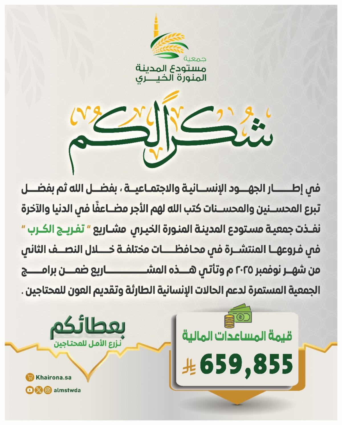 الحمد لله حمداً كثيراً وصلى الله وسلم على افضل المصطفين محمد وعلى اله وصحبه ومن تبعه اما بعد فقد تشرفت في يوم الخميس الموافق 06 / 09 / 1419 هـ بزيارة مستود المدينة المنورة الخيري وشاهدت ما أثلج وأسعد فؤادي من المشائخ والقائمين عليه ولاشك أن هذا العمل عمل جليل وله ثمار عظيمة ويشمل فئة كبيرة من الناس المحتاجين للدعم والذين يعانون من الفقر بشتى صنوفه وألوانه فلا شك انه عمل يفرج هماً ويكشف كرباً ويطعم جائعاً ويكسي عارياً ويدخل الفرح والسرور في نفوس آلمتها الحاجة فأسأل الله العظيم أن يجزي القائمين عليه خير الجزاء وأن يزيدهم توفيقاً وأن يتقبل منهم انه جواد كريم وصلى الله وسلم على نبيبنا محمد وعلى اله وصحبه أجمعين