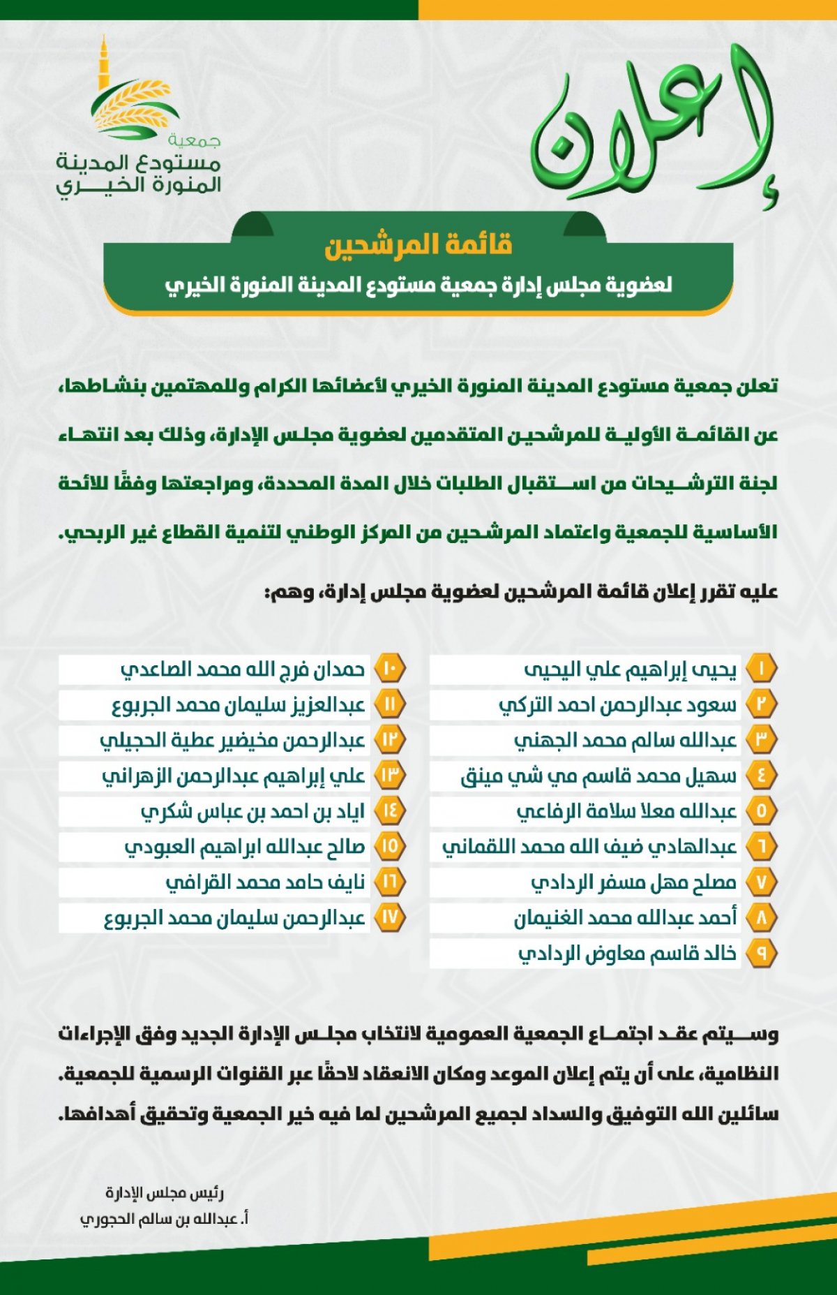 الحمد لله حمداً كثيراً وصلى الله وسلم على افضل المصطفين محمد وعلى اله وصحبه ومن تبعه اما بعد فقد تشرفت في يوم الخميس الموافق 06 / 09 / 1419 هـ بزيارة مستود المدينة المنورة الخيري وشاهدت ما أثلج وأسعد فؤادي من المشائخ والقائمين عليه ولاشك أن هذا العمل عمل جليل وله ثمار عظيمة ويشمل فئة كبيرة من الناس المحتاجين للدعم والذين يعانون من الفقر بشتى صنوفه وألوانه فلا شك انه عمل يفرج هماً ويكشف كرباً ويطعم جائعاً ويكسي عارياً ويدخل الفرح والسرور في نفوس آلمتها الحاجة فأسأل الله العظيم أن يجزي القائمين عليه خير الجزاء وأن يزيدهم توفيقاً وأن يتقبل منهم انه جواد كريم وصلى الله وسلم على نبيبنا محمد وعلى اله وصحبه أجمعين